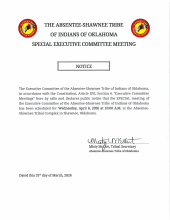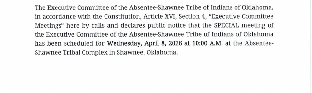 The Executive Committee of the Absentee Shawnee Tribe of Indians of Oklahoma, in accordance with the Constitution, Article XVI, Section 4, "Executive Committee Meetings" hereby calls and declares public notice that the SPECIAL meeting of the Executive Committee of the Absentee Shawnee Tribe of Indians of Oklahoma has been scheduled for Wednesday April 8 2026 at 10 AM at the Absentee Shawnee Tribal Complex in Shawnee, Oklahoma.